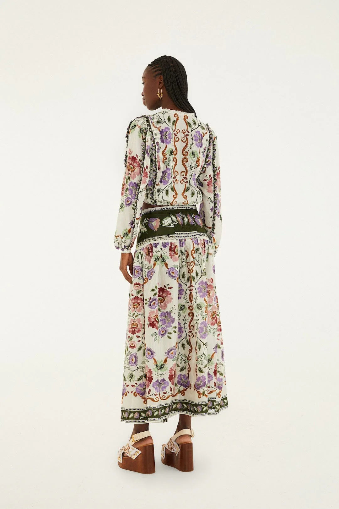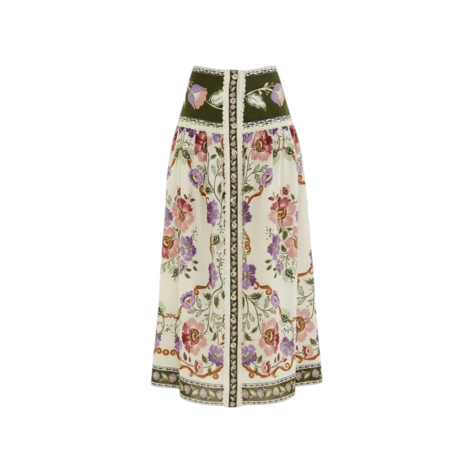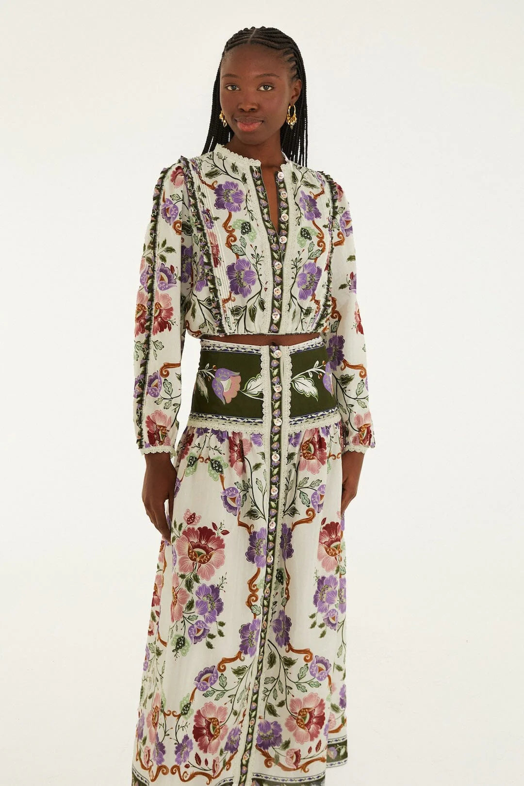 Φούστα μπεζ με πολύχρωμα φλοράλ σχέδια από βαμβάκι και βισκόζη - Farm RIO