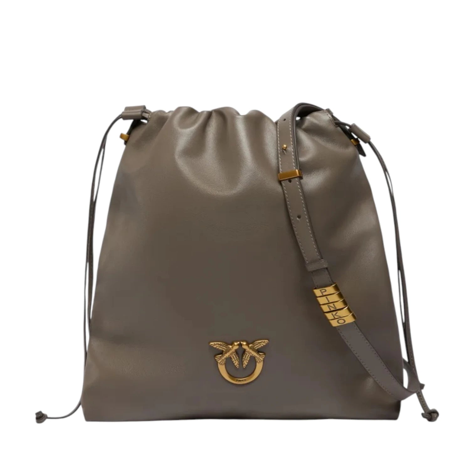 Πουγκί γκρι, δερμάτινο, με χρυσά μέταλλα και δερμάτινο ιμάντα για κράτημα στον ώμο - Pinko