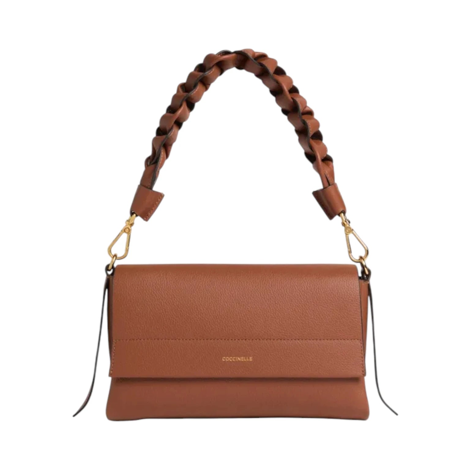 Τσάντα ώμου καφέ, δερμάτινη, με καπάκι και πλεκτο χερούλι για κράτημα στον ώμο - Coccinelle