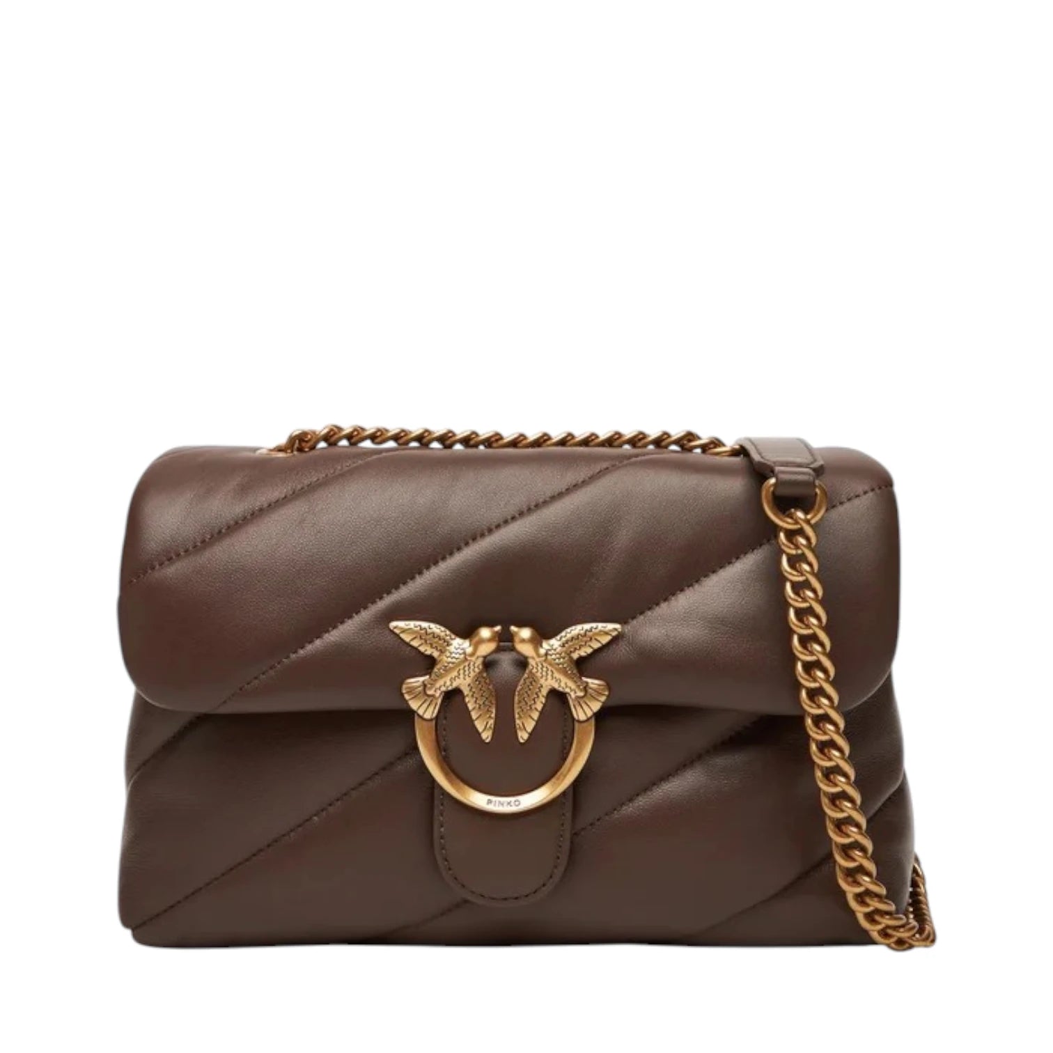 Τσάντα ώμου Puff, καφέ δερμάτινη με αλυσίδα για κράτημα στον ώμο - Pinko