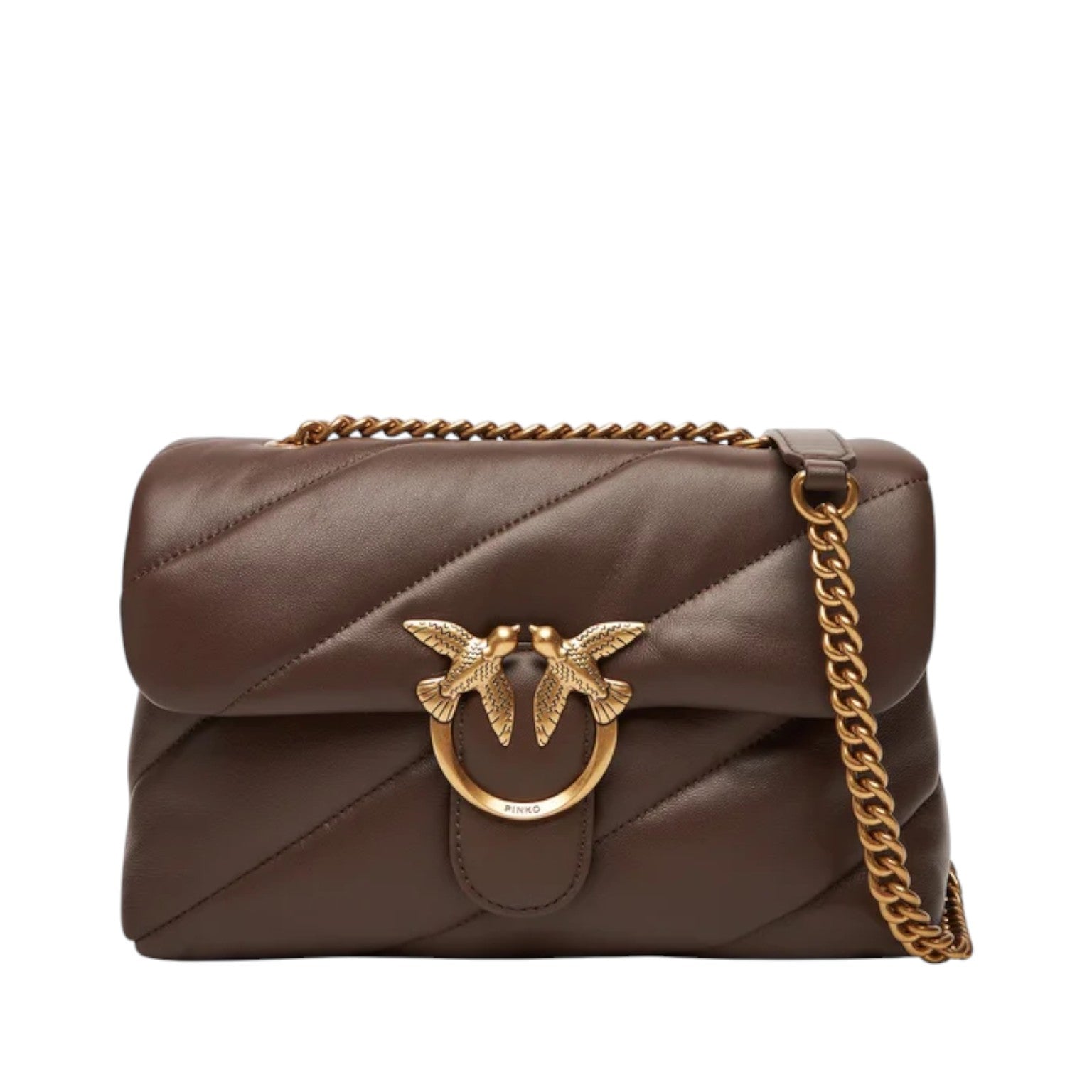 Τσάντα ώμου Puff, καφέ δερμάτινη με αλυσίδα για κράτημα στον ώμο - Pinko