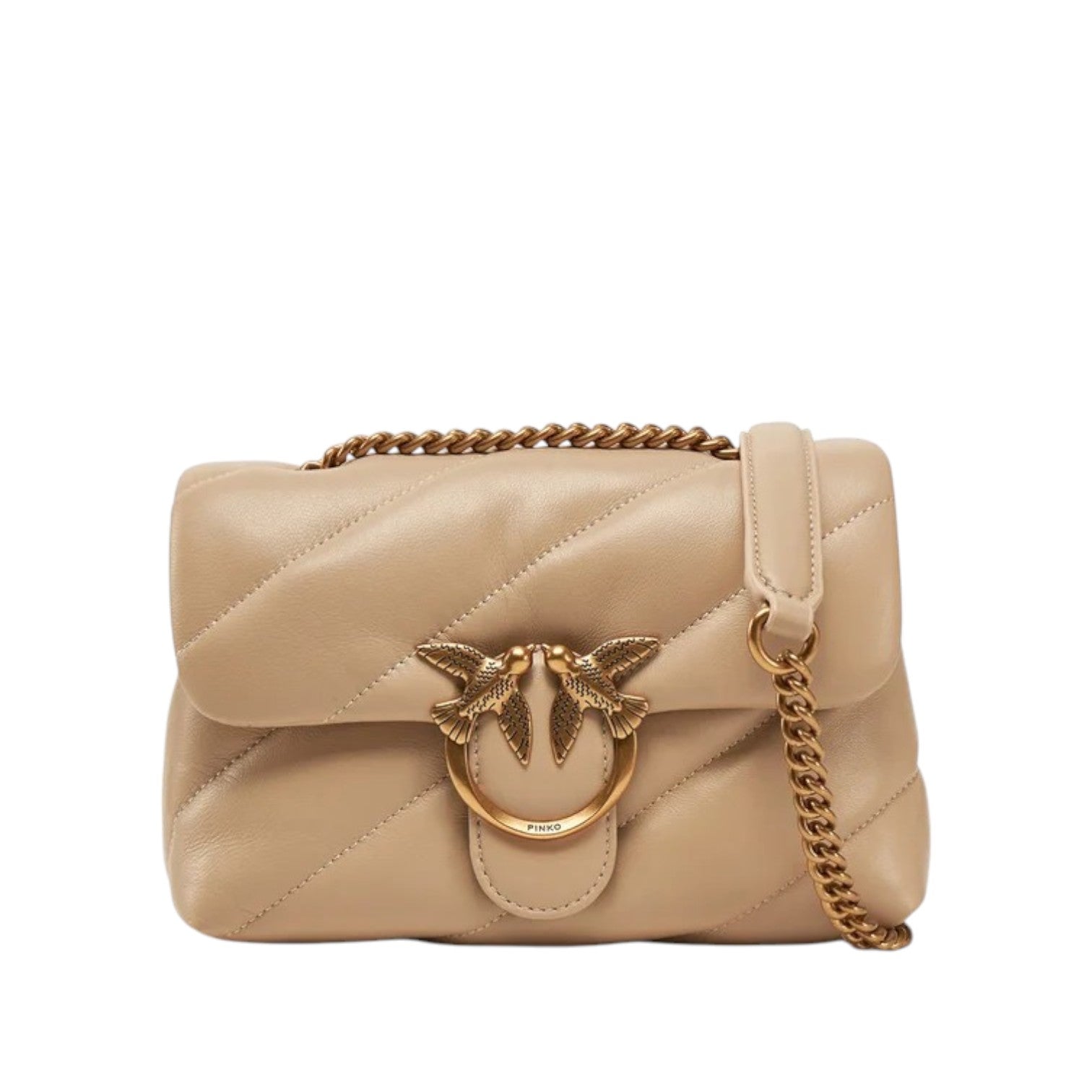 Τσάντα ώμου μπεζ με χρυσά μέταλλα, δερμάτινη, με αλυσίδα για κράτημα στον ώμο ή χιαστί Mini Puff Pinko