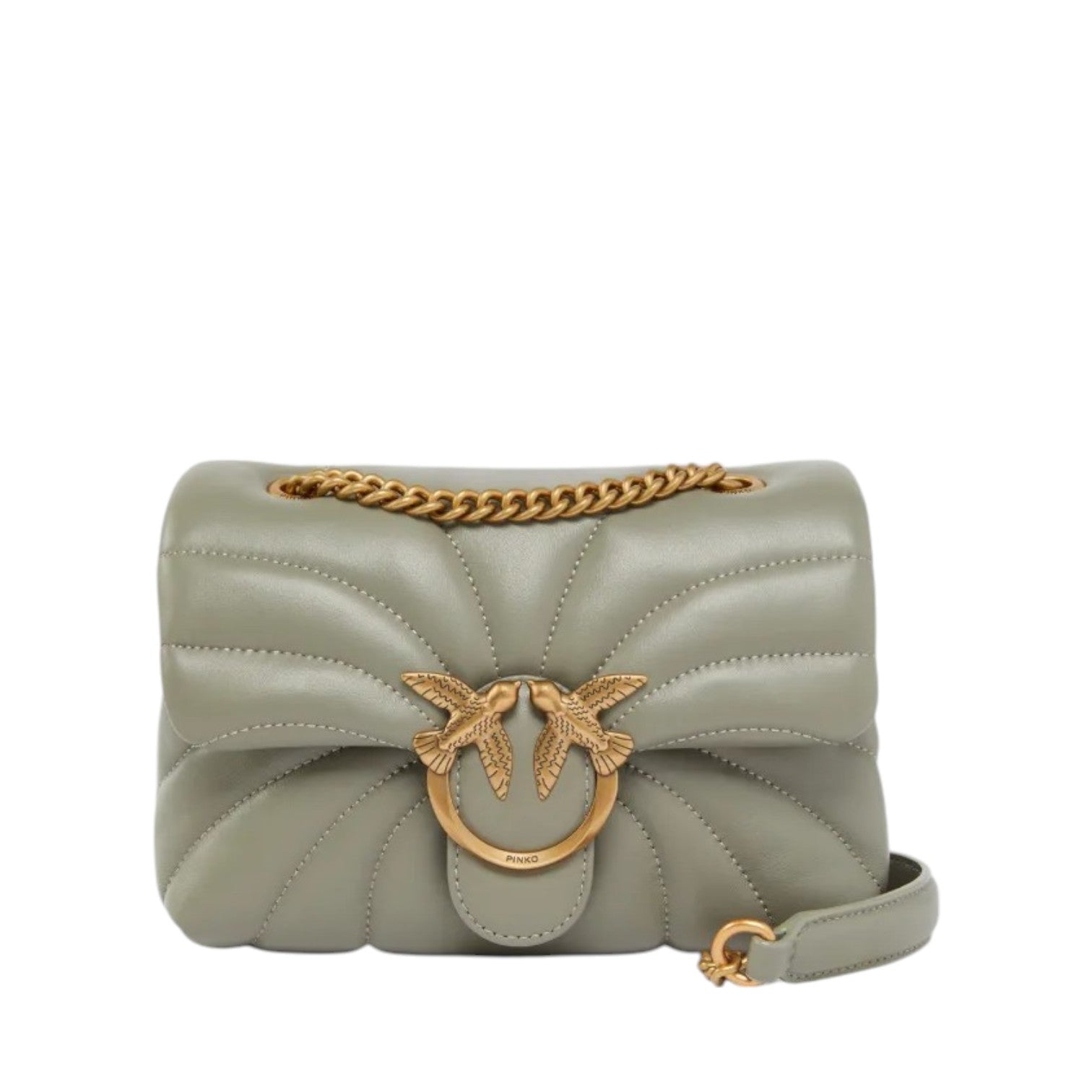 Τσάντα ώμου χακί με χρυσά μέταλλα, δερμάτινη, με διακοσμητικές ραφές κατά μήκος και αλυσίδα για κράτημα στον ώμο - Pinko.