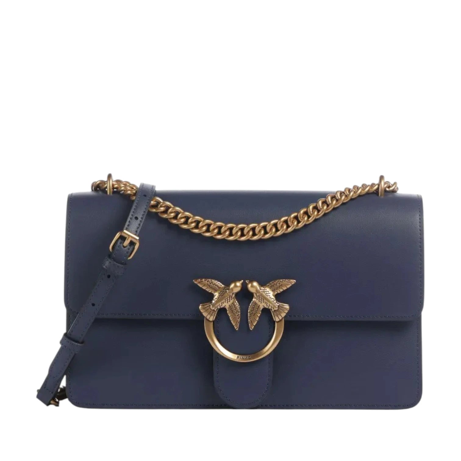 Τσάντα ώμου μπλε σκούρα, δερμάτινη, με χρυσά μέταλλα και σήμα και αλυσίδα με λουράκι για τον ώμο ή χιαστί - Pinko