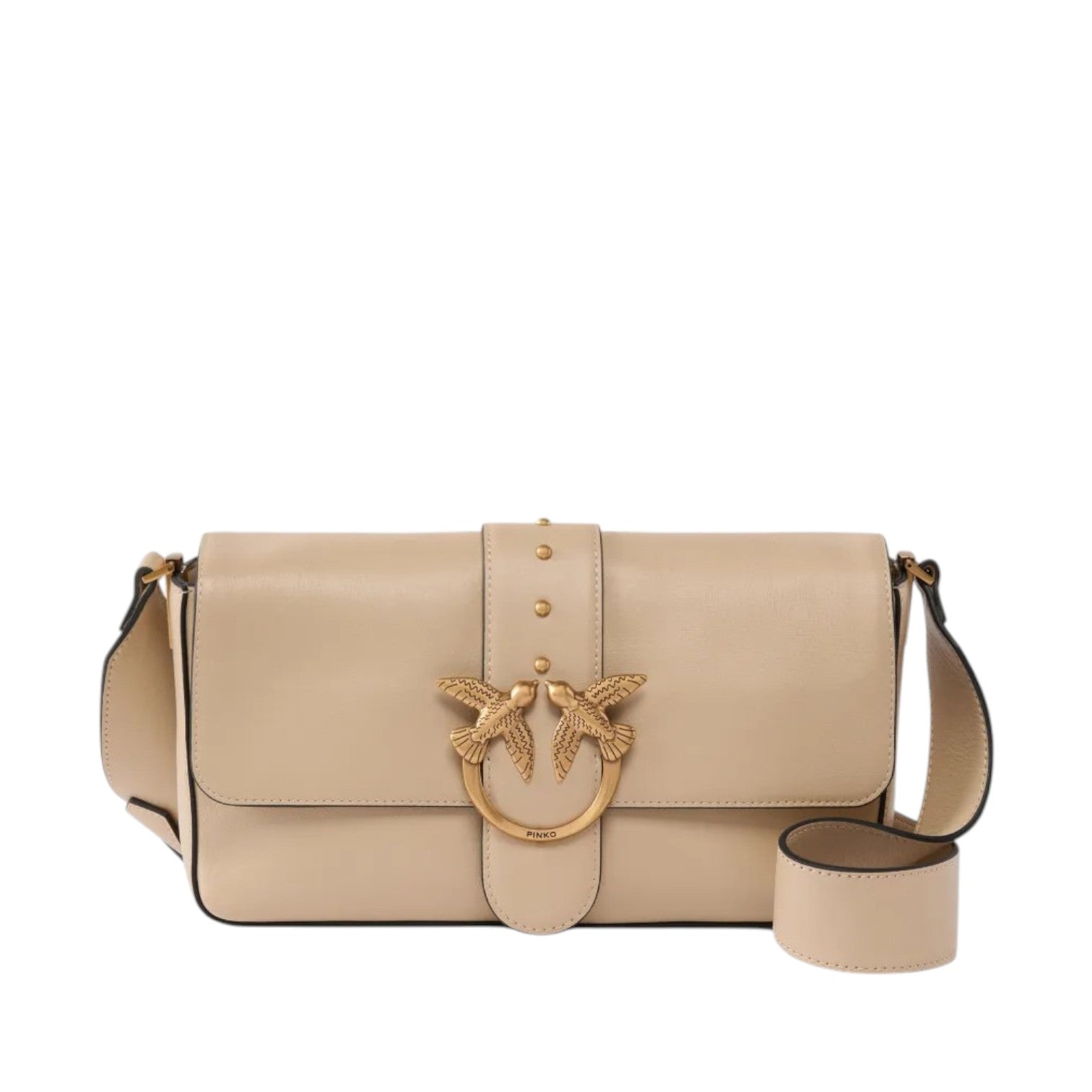 Τσάντα ώμου μπεζ με χρυσά μέταλλα, δερμάτινη με ιμάντα για κράτημα στον ώμο ή χιαστί Mini Puff Pinko
