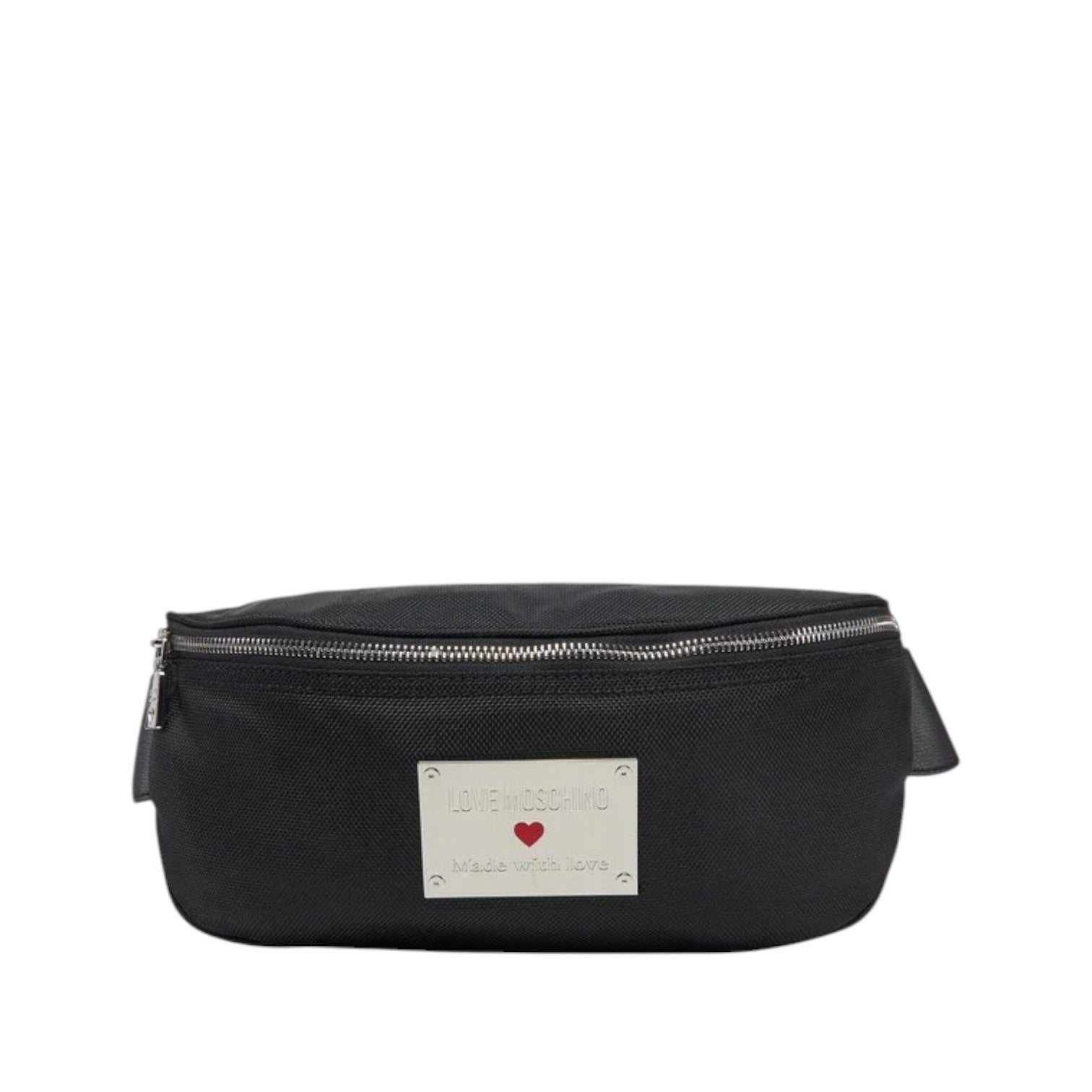 Τσαντάκι μέσης μαύρο, υφασμάτινο, με διακοσμητικό σήμα στο μπροστινό μέρος και ιμάντα για κράτημα στη μέση ή χιαστί Love Moschino