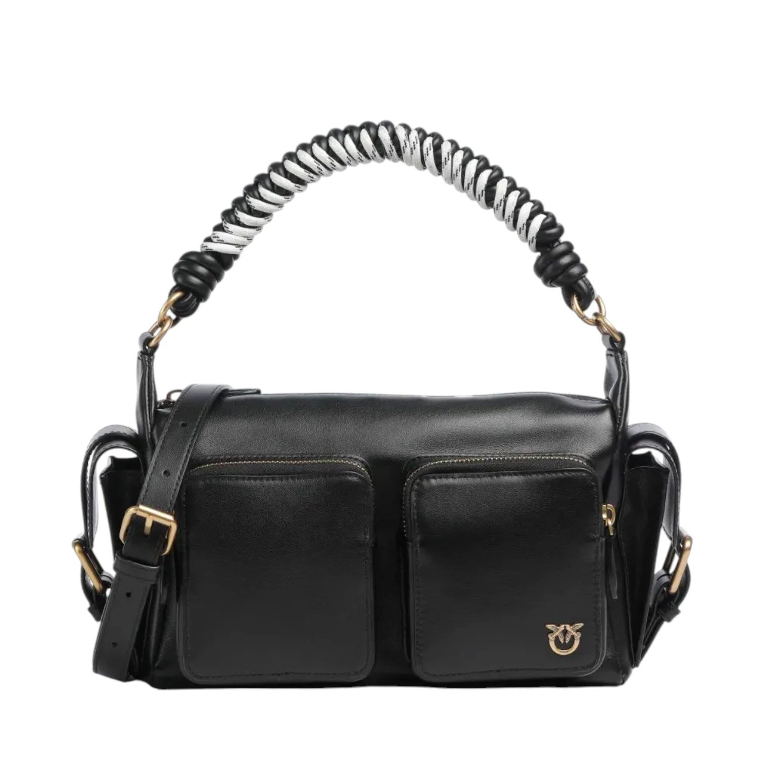 Τσάντα ώμου μαύρη, δερμάτινη, με τσέπες στο εξωτερικό και δερμάτινο πλεκτό ιμάντα για τον ώμο - Pinko