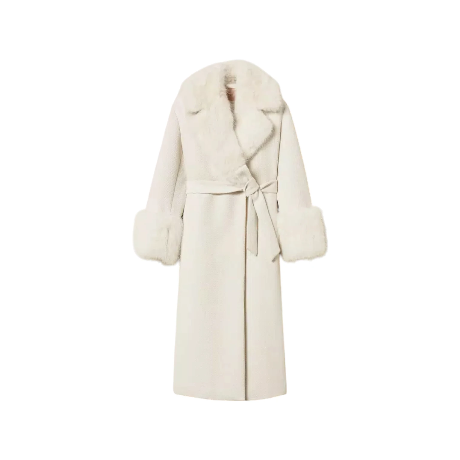 Παλτό λευκό, απο σύνθεση με μαλλί, μακρύ με οικολογική γούνα στα μανίκια και στον γιακά και κλείσιμο με ζώνη στη μέση – Twinset