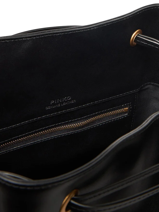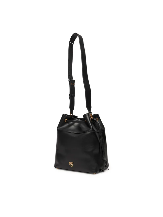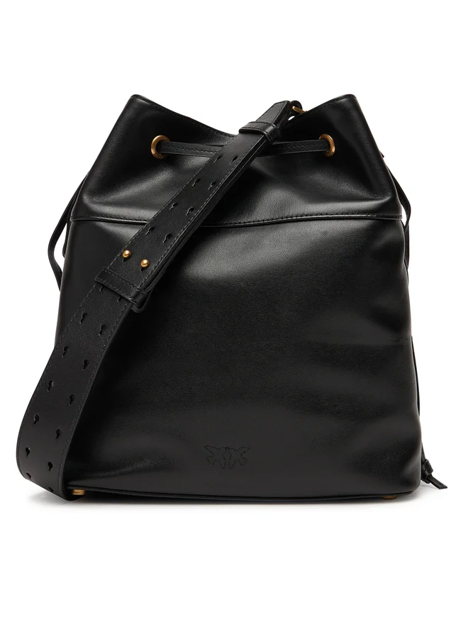 Πουγκί μαύρο, δερμάτινο, με χρυσά μέταλλα και δερμάτινο ιμάντα για κράτημα στον ώμο – Pinko
