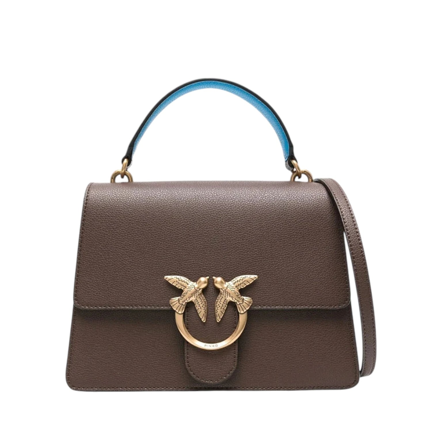 Τσάντα top handle καφέ με γαλάζιο εσωτερικό, δερμάτινη με χερούλι και αλυσίδα για κράτημα στον ώμο ή χιαστί - Pinko