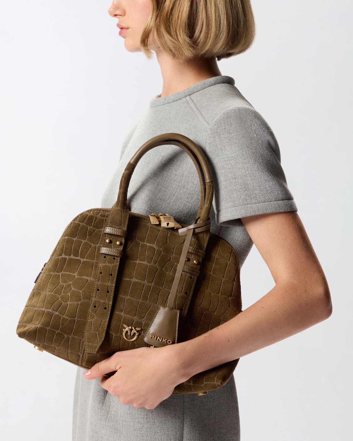 Τσάντα Tote, πράσινη με χρυσά μέταλλα και σήμα, όπου κλείνει με φερμουάρ με λουκέτο και διαθέτει ιμάντα και χερούλια τα οποία ρυθμίζονται για να κρατιέται και στον ώμο – Pinko.